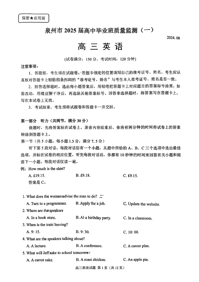福建省泉州市2025届高中毕业班质量监测(一)英语