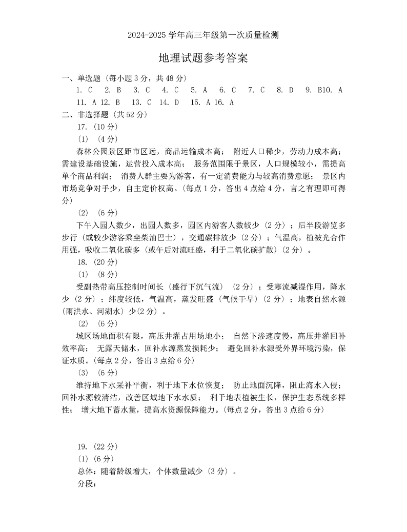 福建省福州市2024-2025学年高三年级上学期第一次质量检测 地理答案