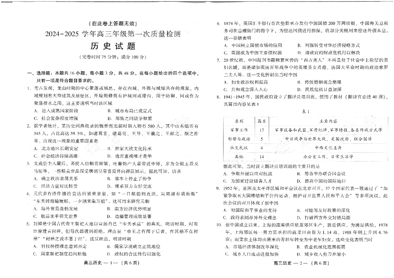 福建省福州市2024-2025学年高三年级上学期第一次质量检测 历史