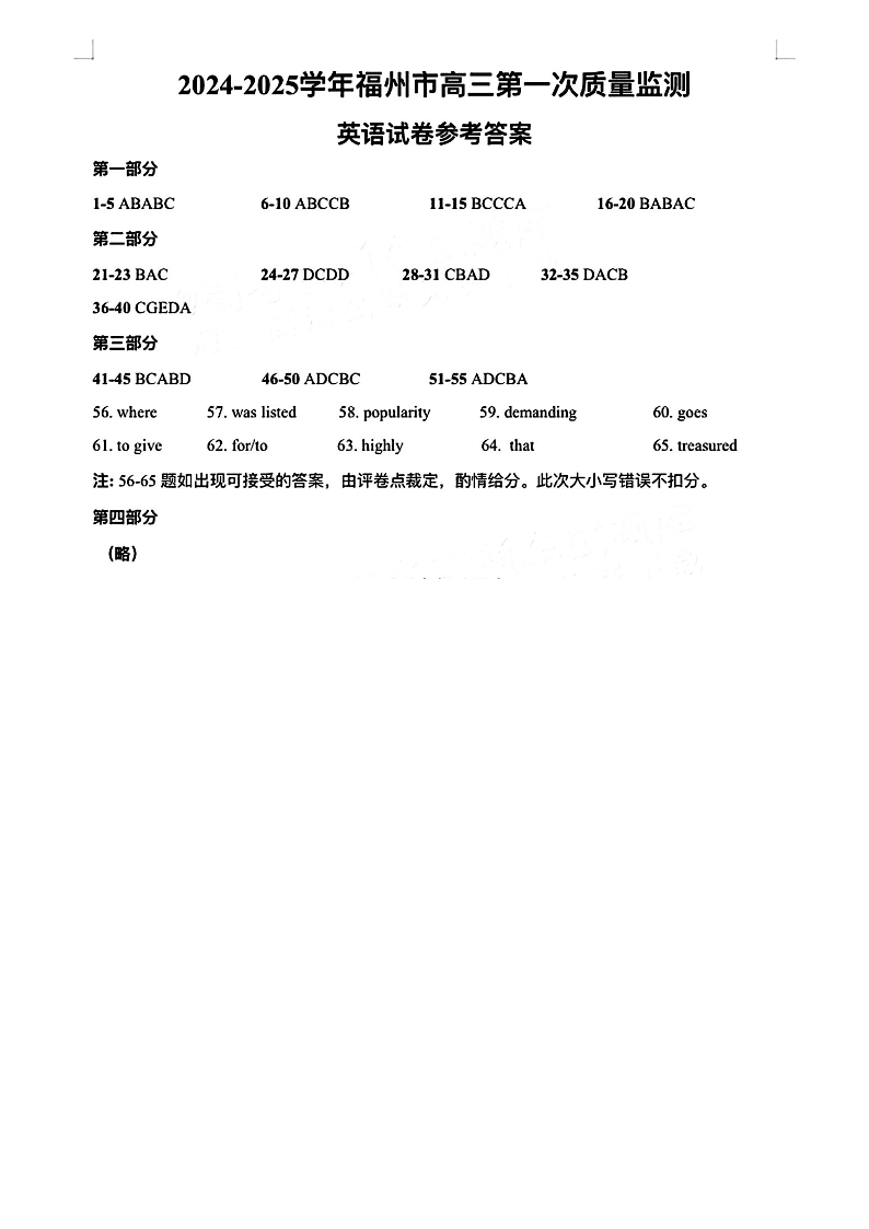 福建省福州市2024-2025学年高三年级上学期第一次质量检测 英语答案