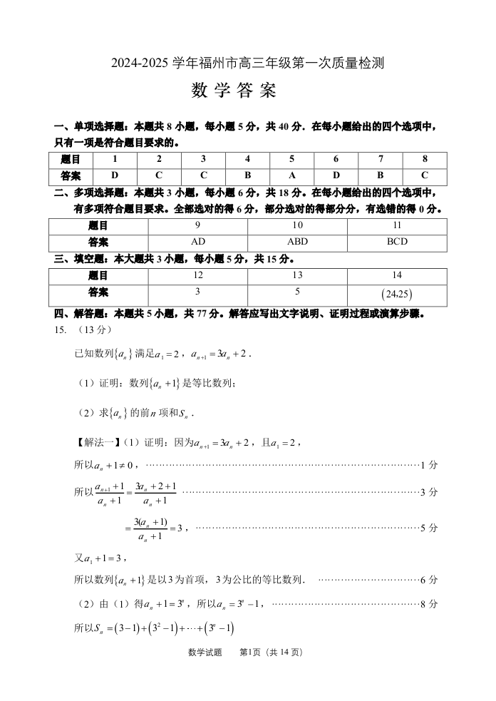 福建省福州市2024-2025学年高三年级上学期第一次质量检测 数学答案