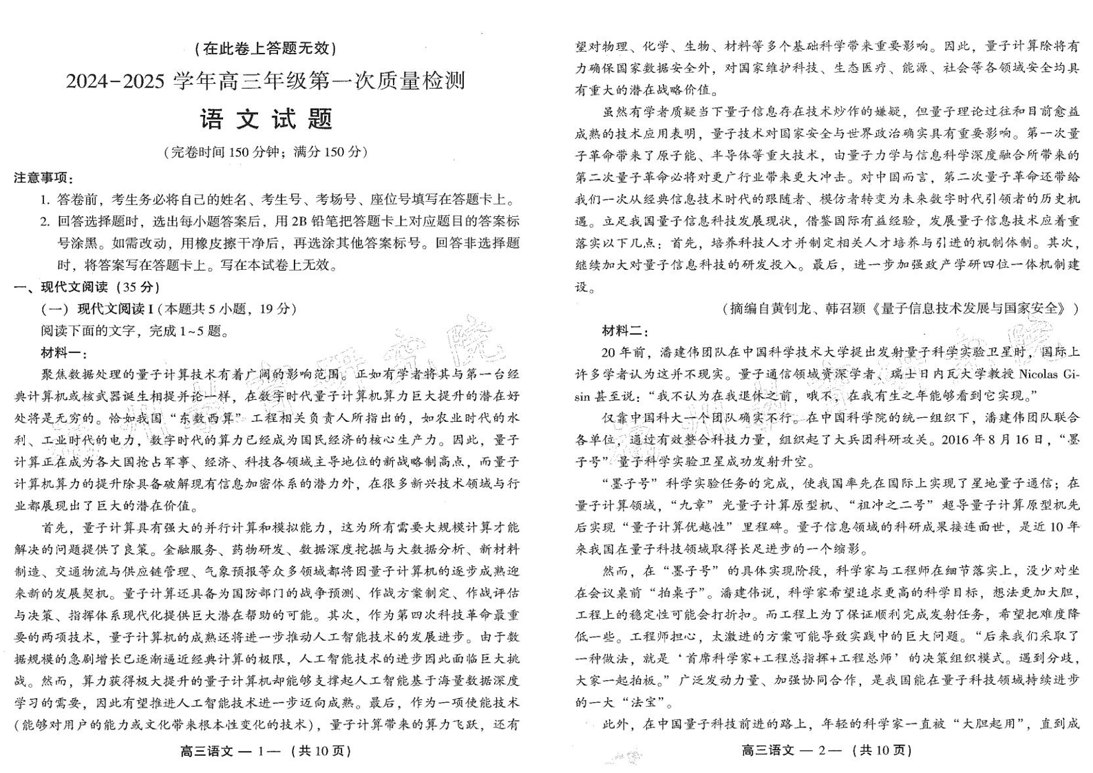 福建省福州市2024-2025学年高三年级上学期第一次质量检测 语文