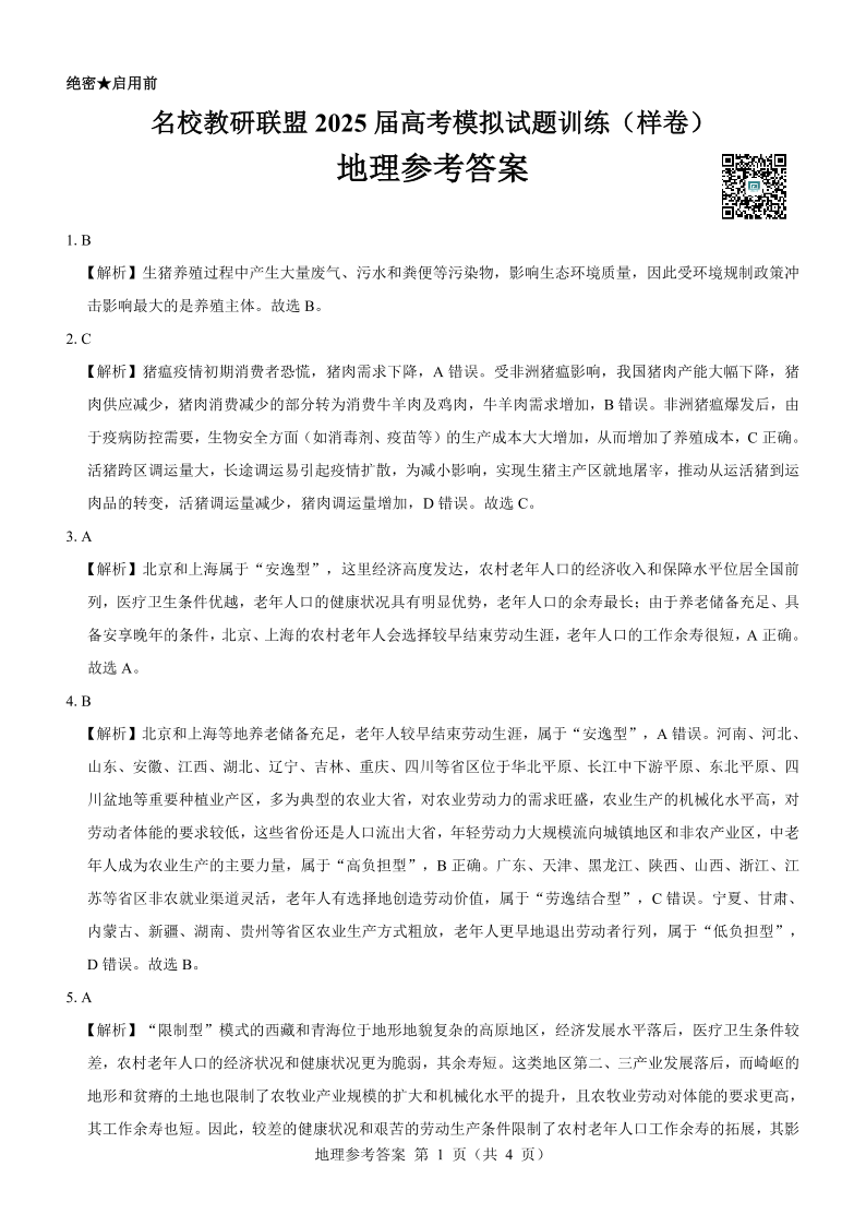 名校教研联盟2025届高考模拟试题训练(样卷)地理参考答案