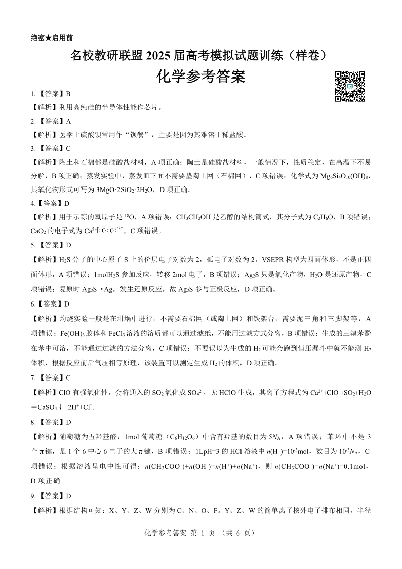 名校教研联盟2025届高考模拟试题训练(样卷)化学参考答案