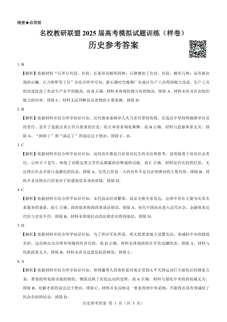 名校教研联盟2025届高考模拟试题训练(样卷)历史参考答案