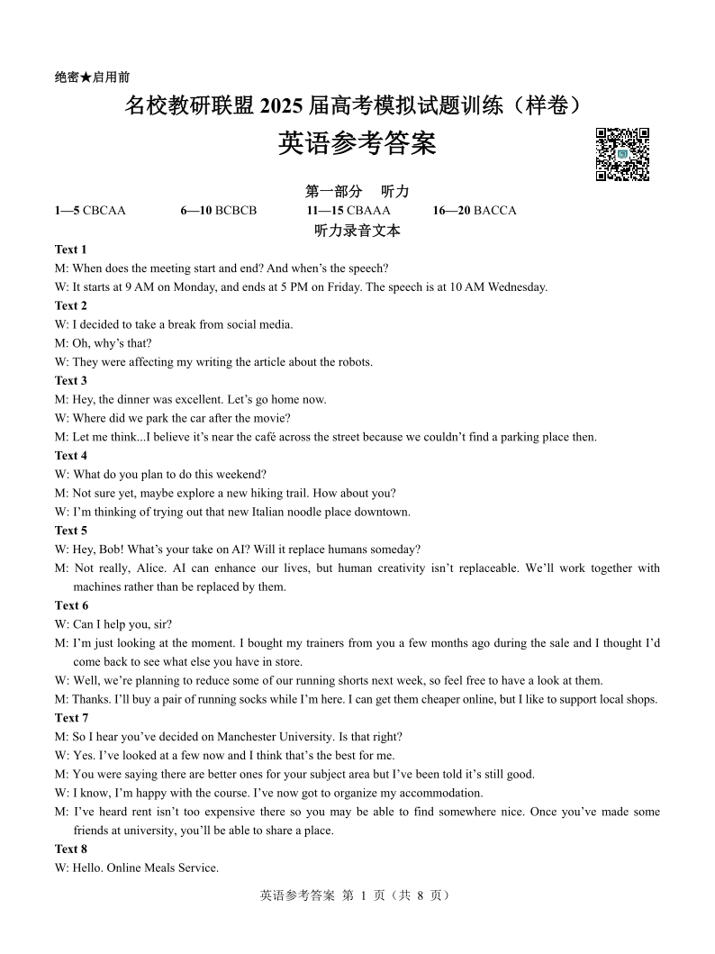 名校教研联盟2025届高考模拟试题训练(样卷)英语答题卡