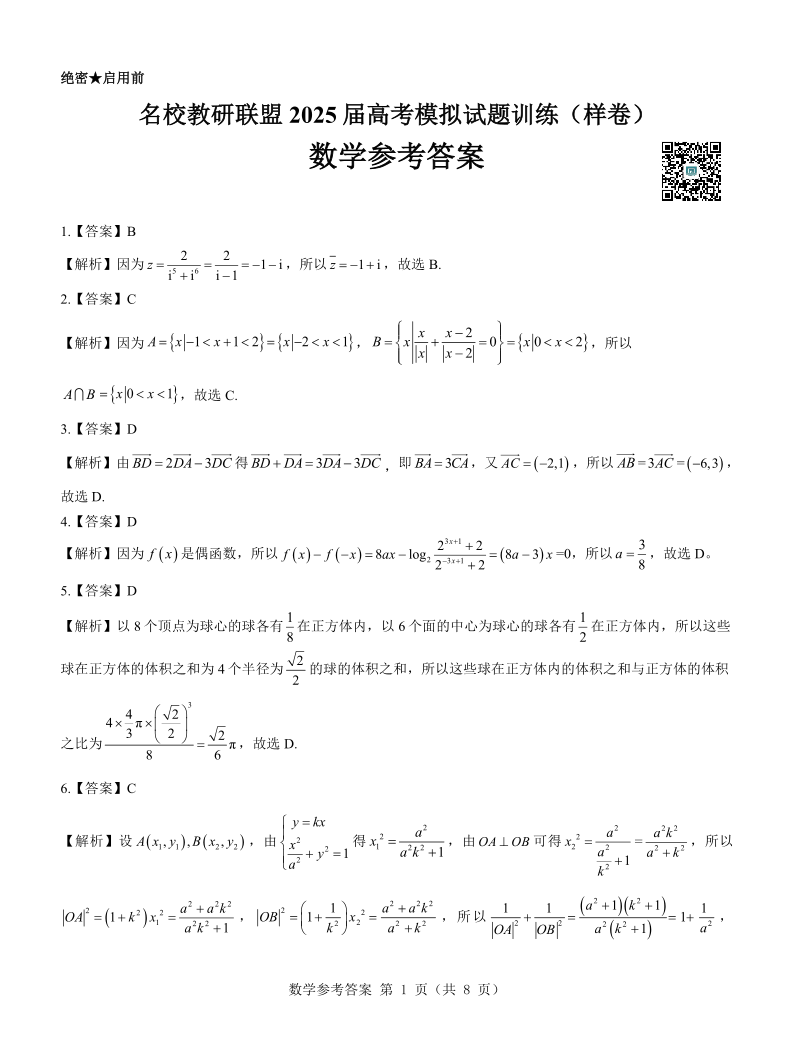 名校教研联盟2025届高考模拟试题训练(样卷)数学参考答案
