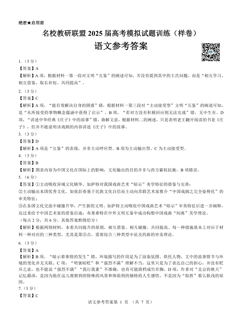 名校教研联盟2025届高考模拟试题训练(样卷)语文参考答案