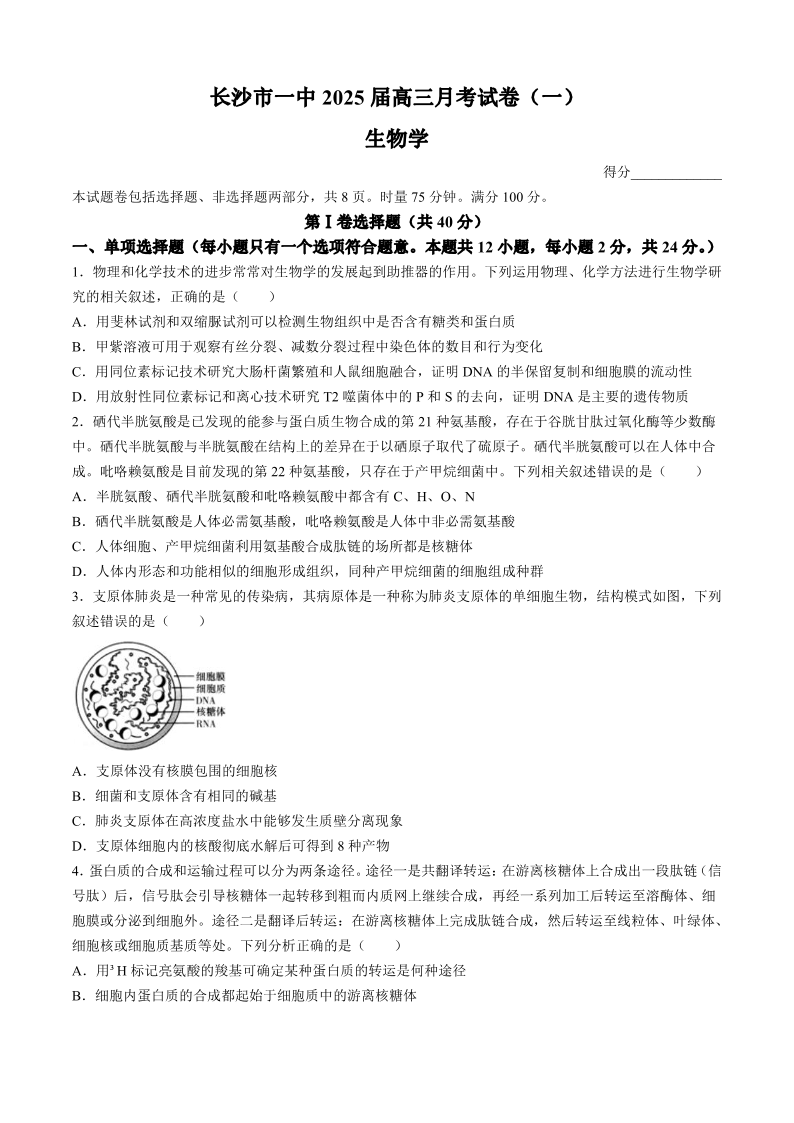 湖南省长沙市第一中学2025届高三上学期月考卷(一)生物