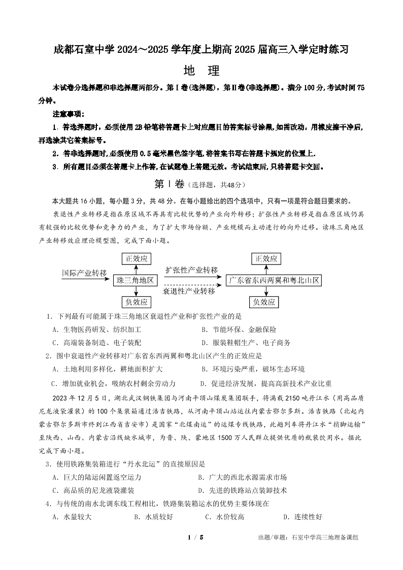 成都石室中学2024-2025学年度上期高2025届定时练习 地理