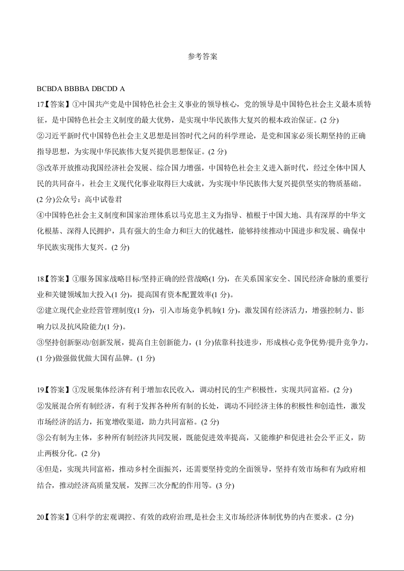成都石室中学2024-2025学年度上期高2025届定时练习 政治答案