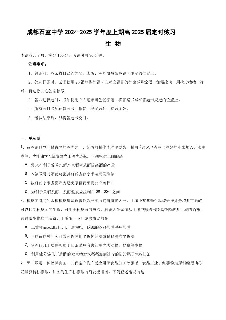 成都石室中学2024-2025学年度上期高2025届定时练习 生物