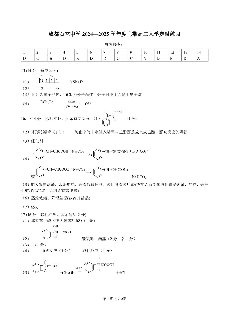 成都石室中学2024-2025学年度上期高2025届定时练习 化学答案