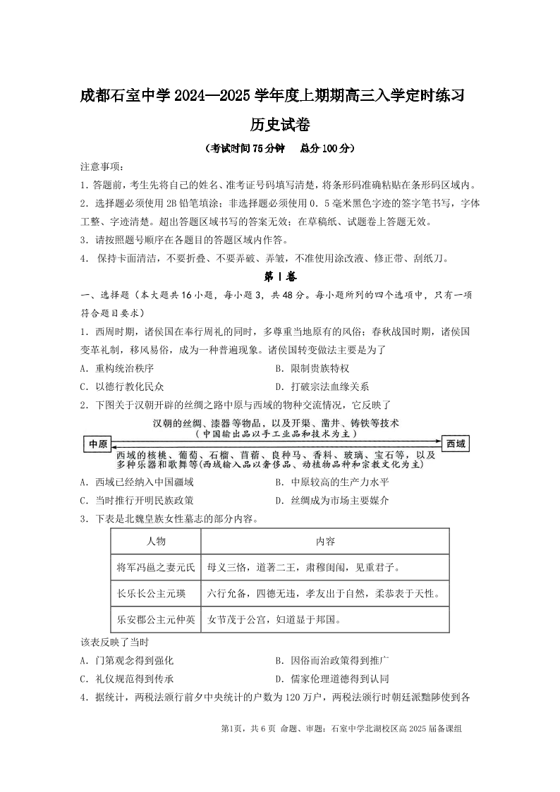 成都石室中学2024-2025学年度上期高2025届定时练习 历史