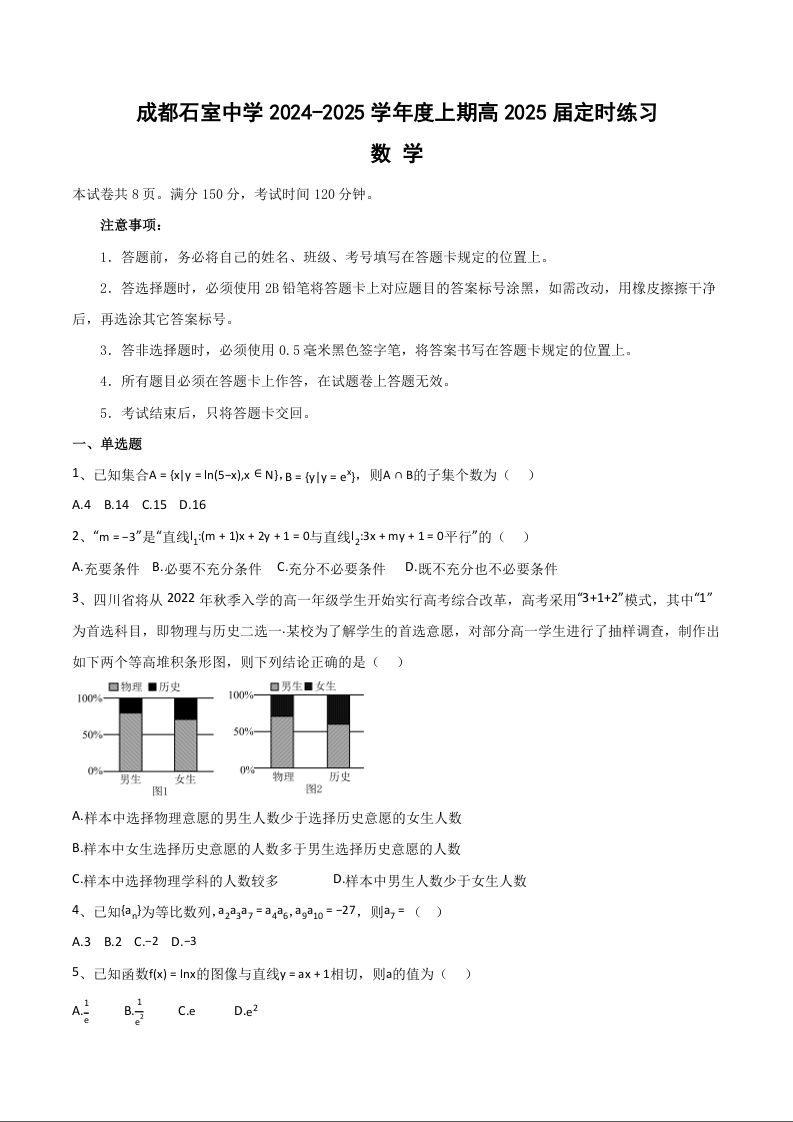 成都石室中学2024-2025学年度上期高2025届定时练习 数学