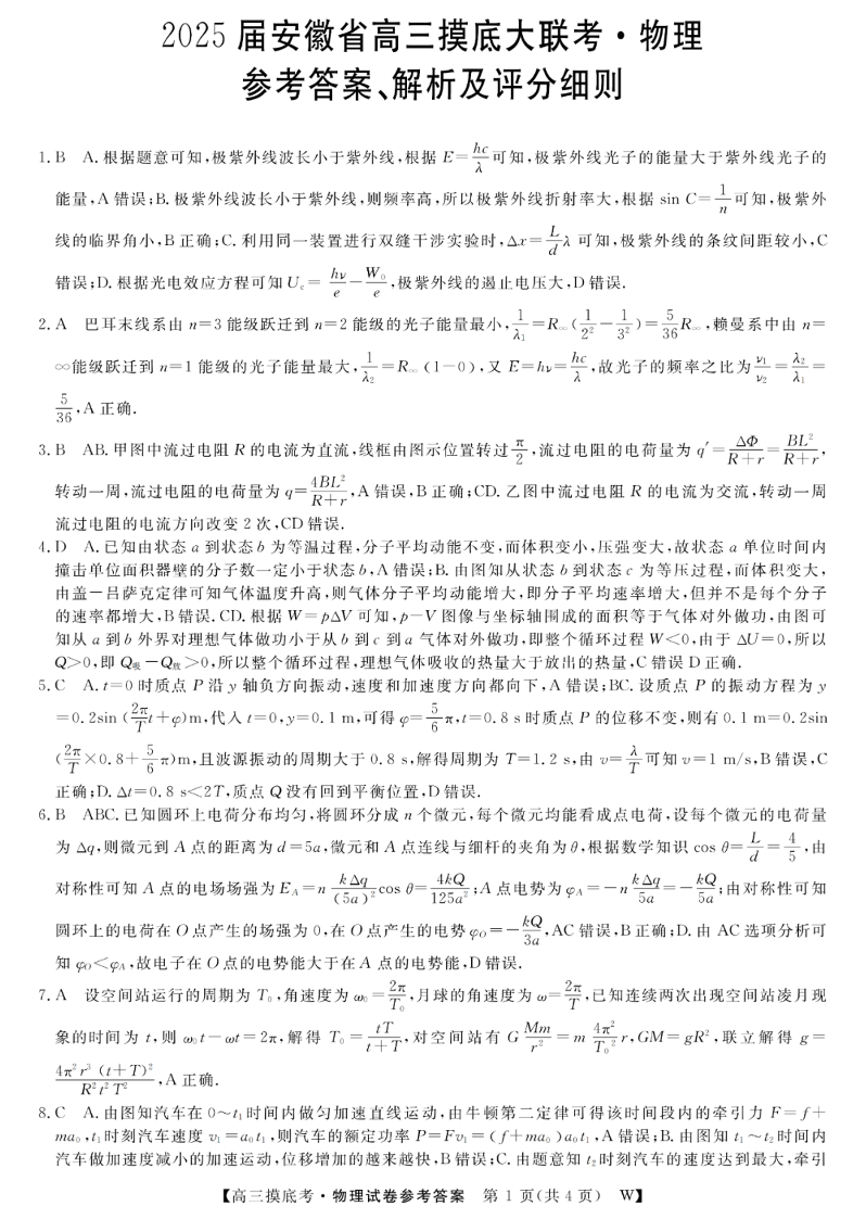 2025届安徽省皖南八校高三摸底考试 物理答案