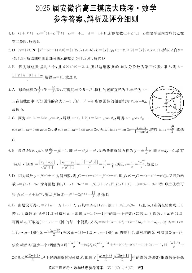 2025届安徽省皖南八校高三摸底考试 数学答案