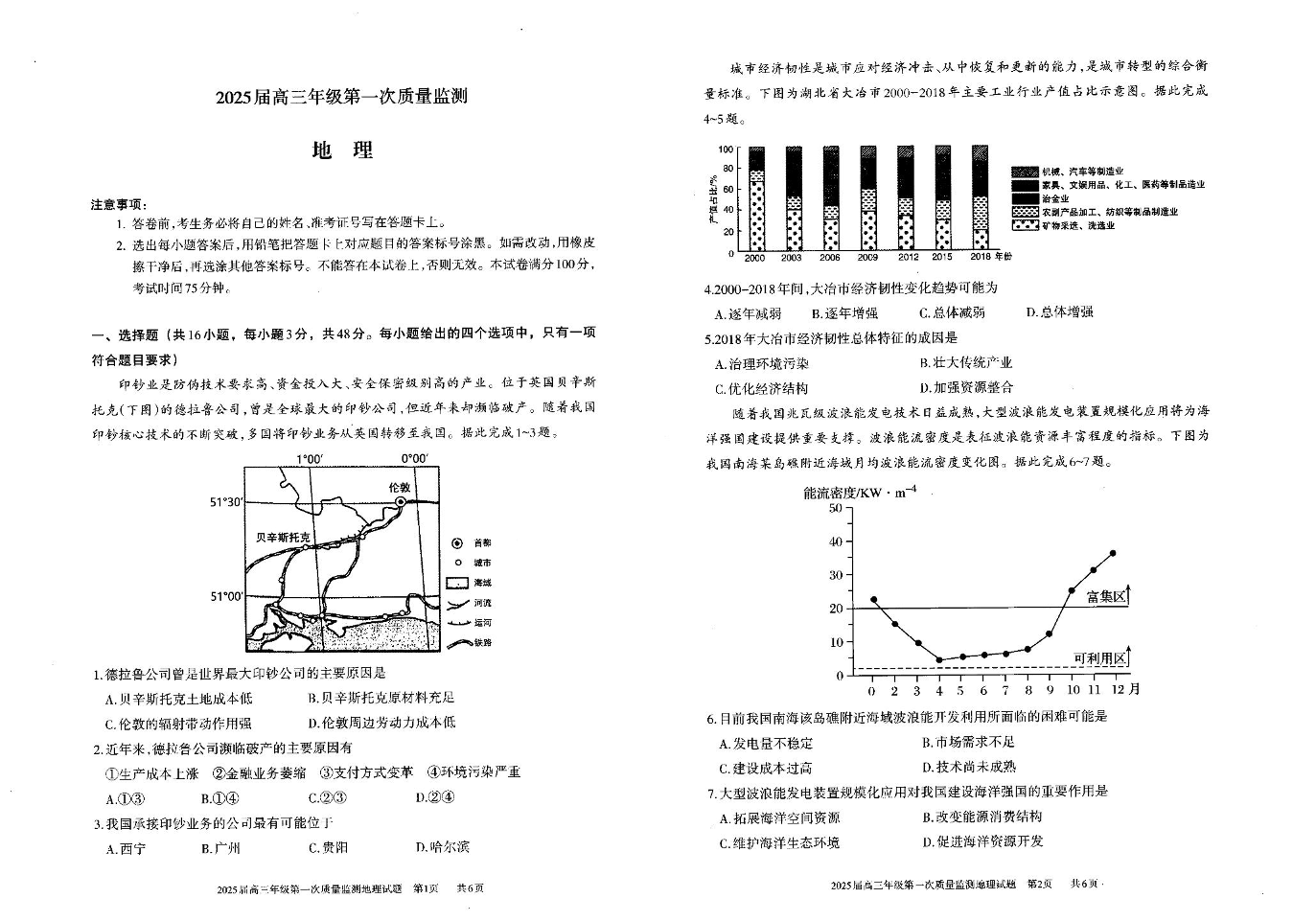 内蒙古呼和浩特市2025届高三上学期第一次质量监测 地理