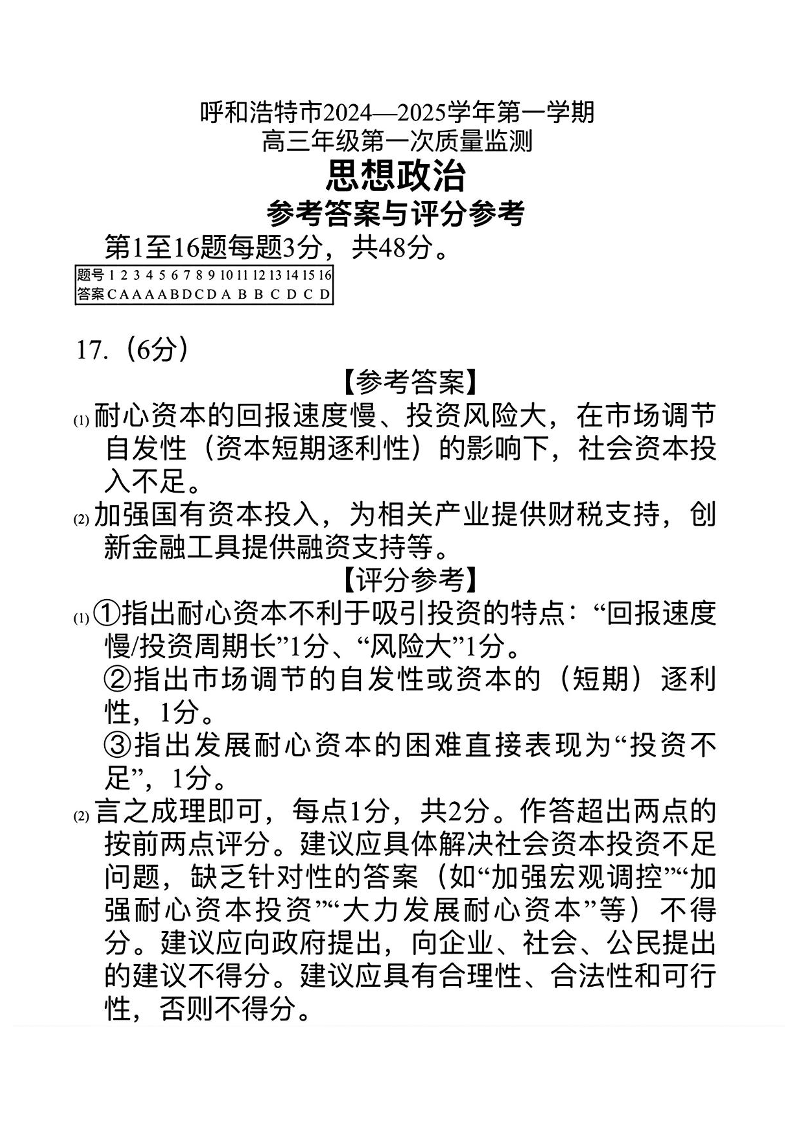 内蒙古呼和浩特市2025届高三上学期第一次质量监测 政治答案