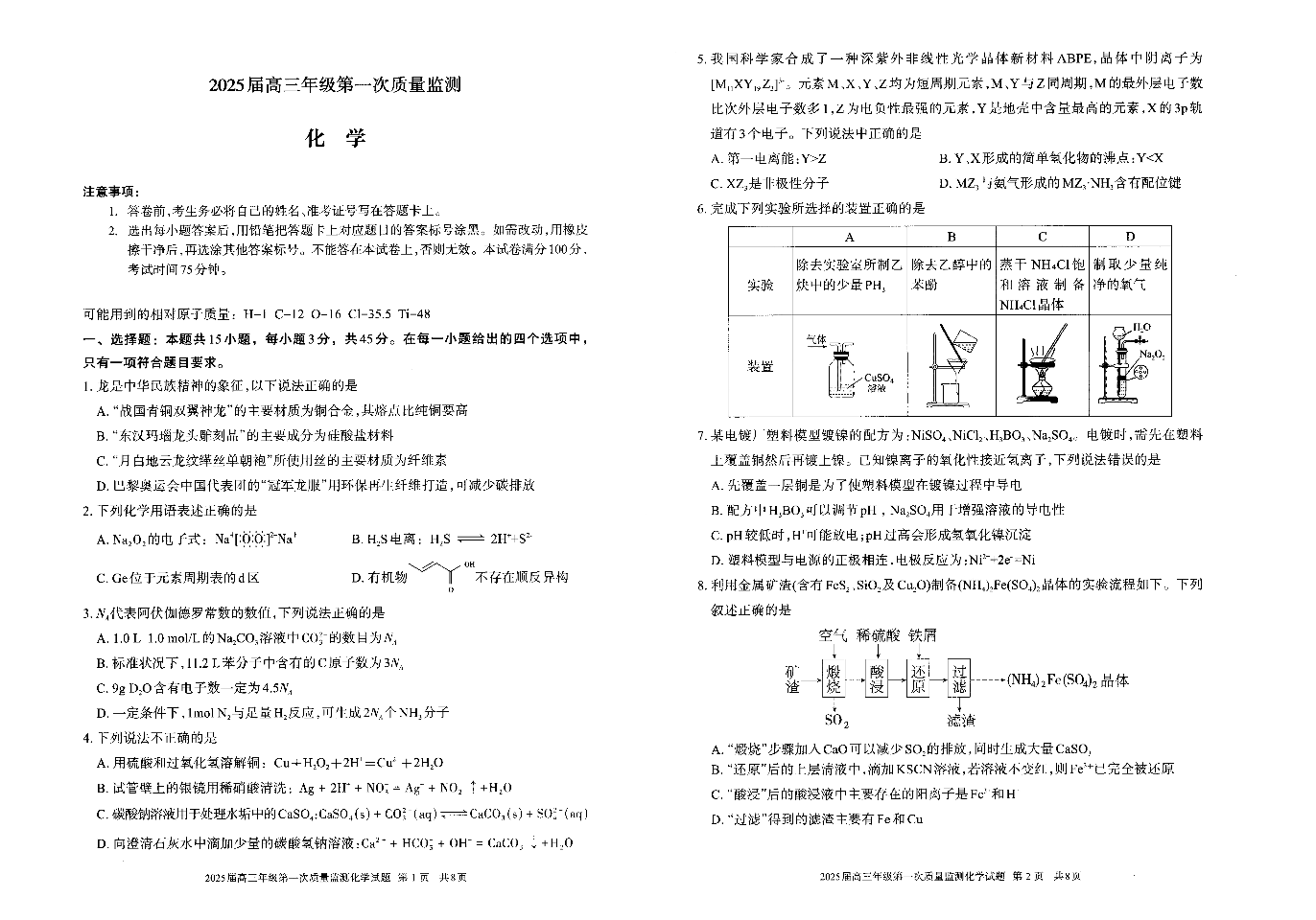 内蒙古呼和浩特市2025届高三上学期第一次质量监测 化学