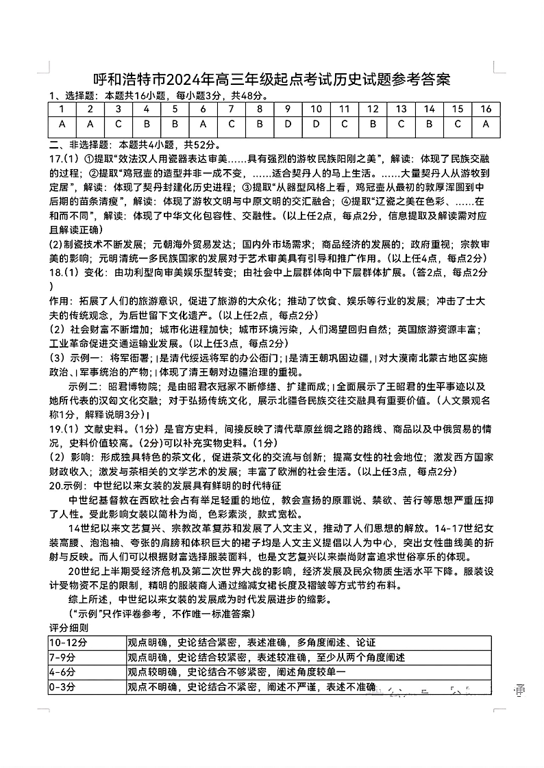 内蒙古呼和浩特市2025届高三上学期第一次质量监测 历史答案