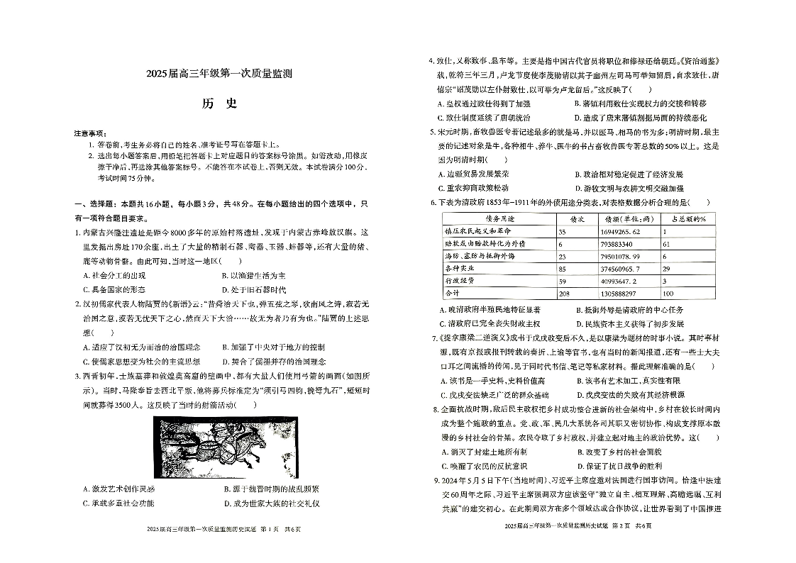 内蒙古呼和浩特市2025届高三上学期第一次质量监测 历史