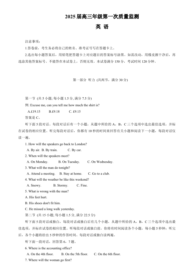 内蒙古呼和浩特市2025届高三上学期第一次质量监测 英语