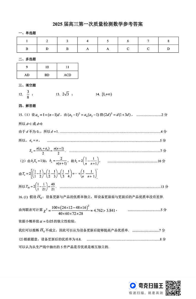 内蒙古呼和浩特市2025届高三上学期第一次质量监测 数学答案