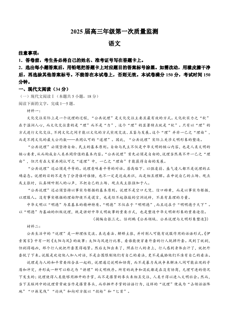 内蒙古呼和浩特市2025届高三上学期第一次质量监测 语文