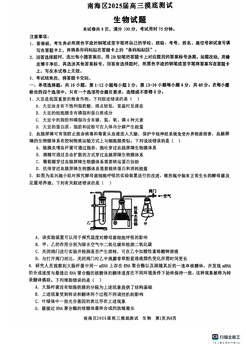 广东省佛山市南海区2024-2025学年高三上学期开学摸底测试 生物