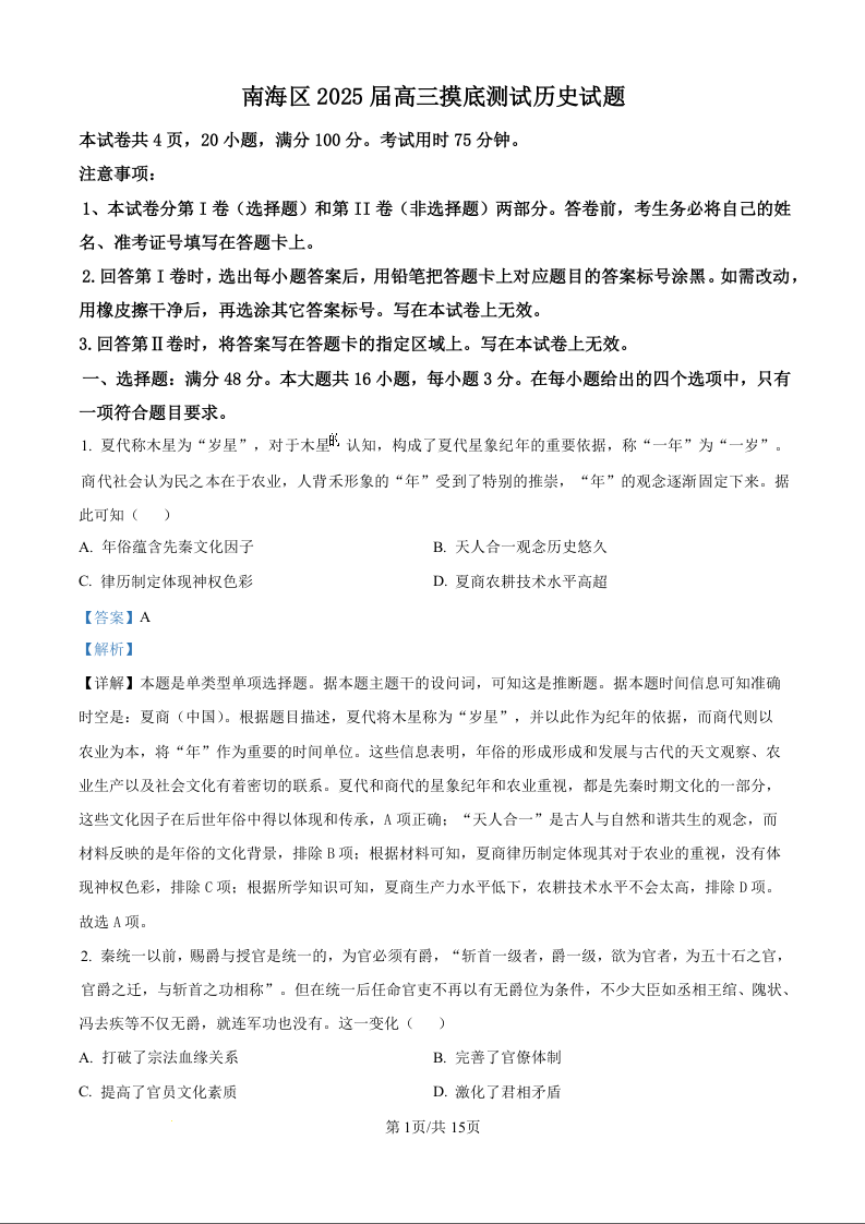 广东省佛山市南海区2024-2025学年高三上学期开学摸底测试 历史