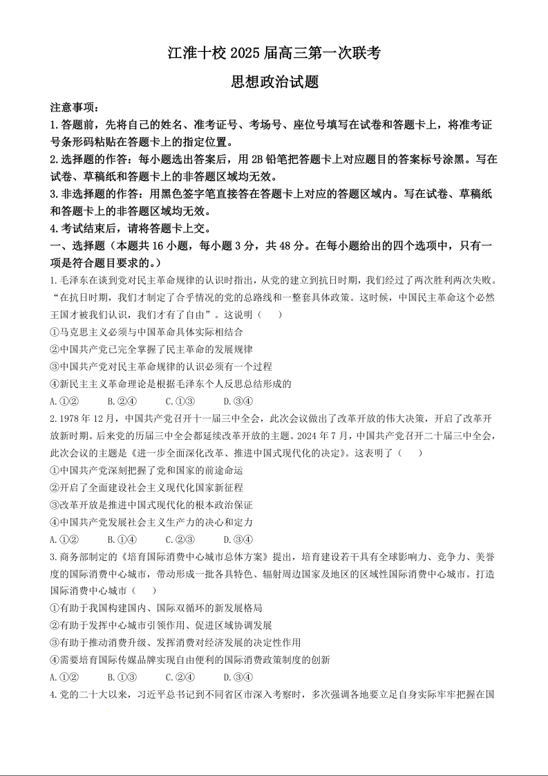 安徽省江淮十校2025届高三年级第一次联考 政治