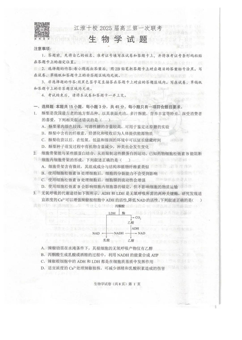 安徽省江淮十校2025届高三年级第一次联考 生物