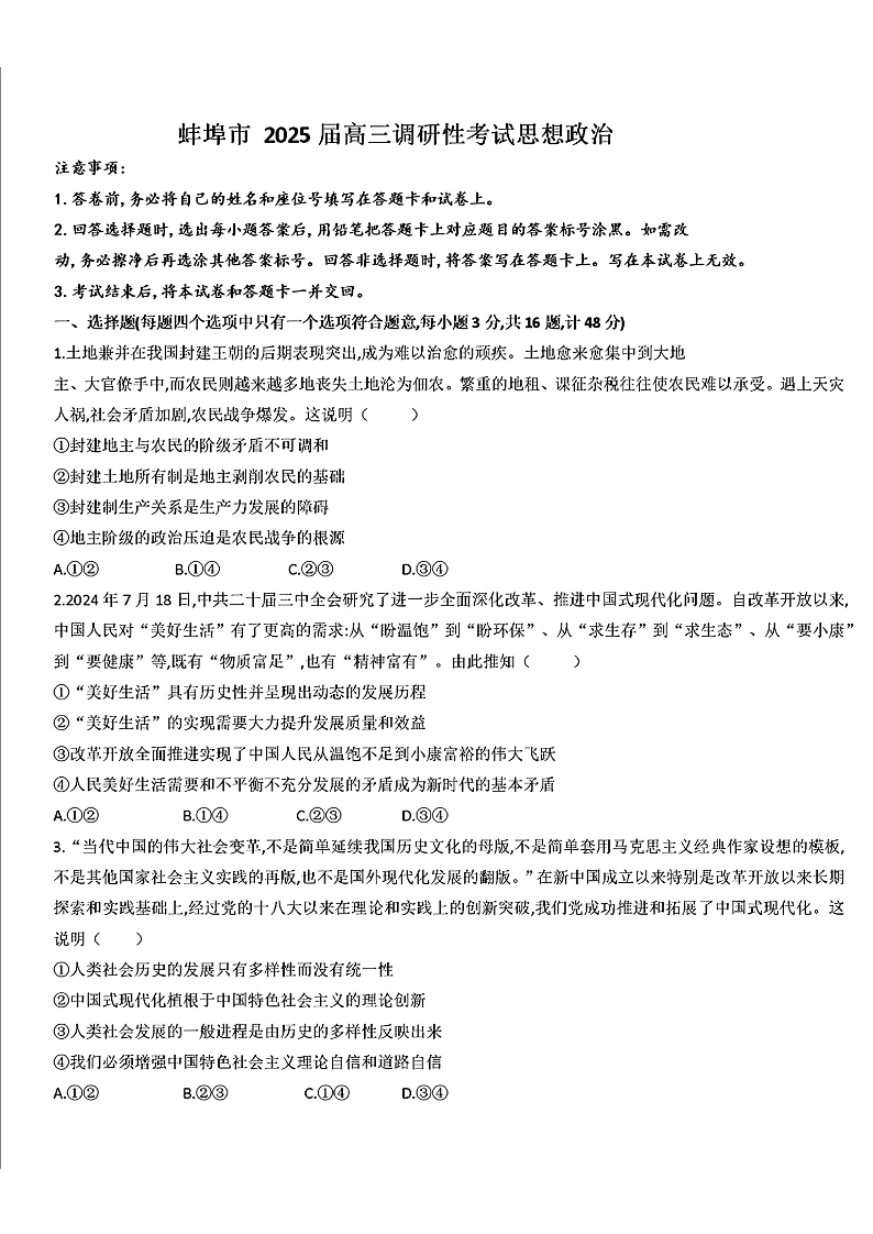 安徽省蚌埠市2025届高三年级上学期8月调研性考试 政治