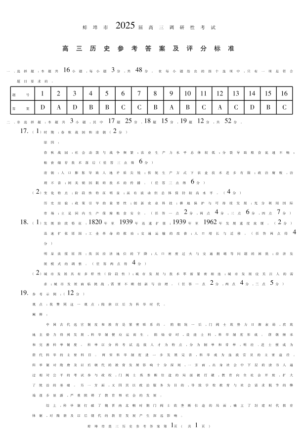 安徽省蚌埠市2025届高三年级上学期8月调研性考试 历史答案