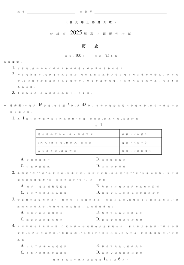 安徽省蚌埠市2025届高三年级上学期8月调研性考试 历史
