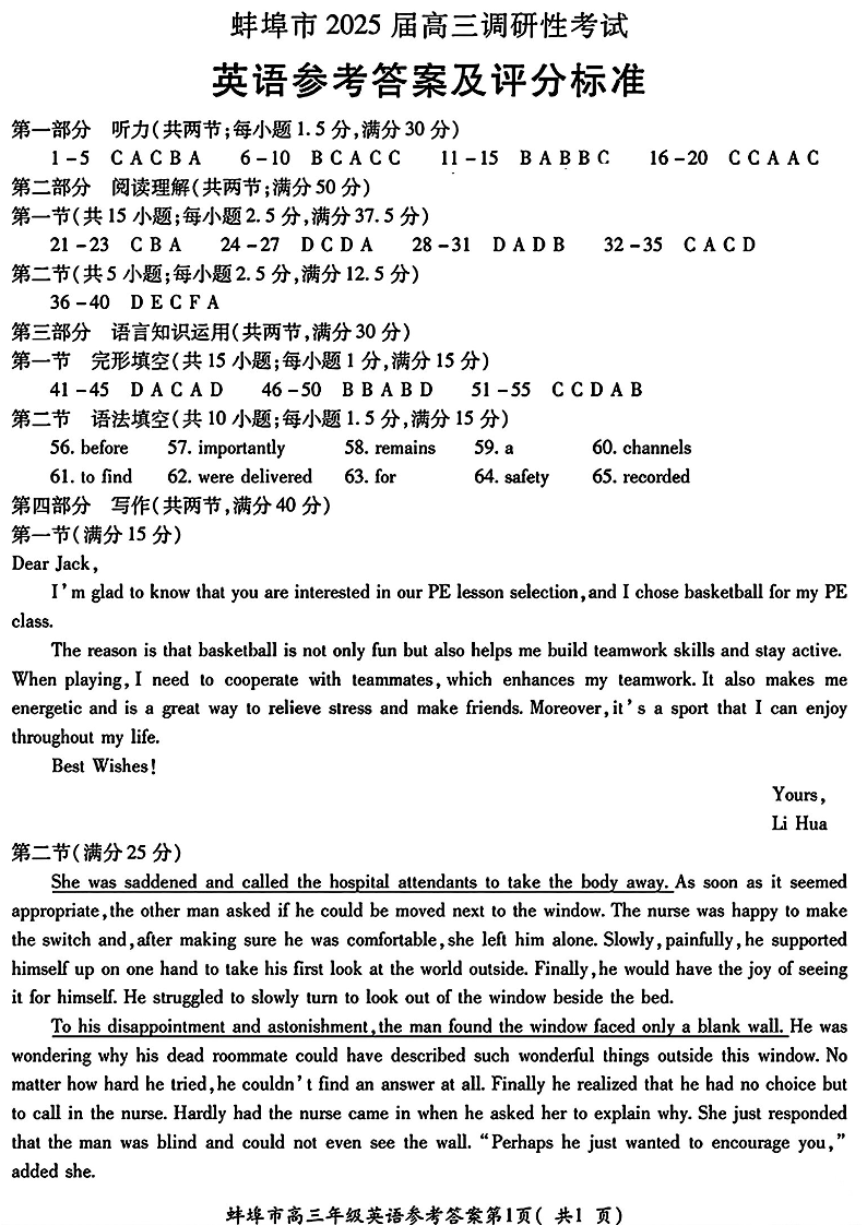 安徽省蚌埠市2025届高三年级上学期8月调研性考试 英语答案