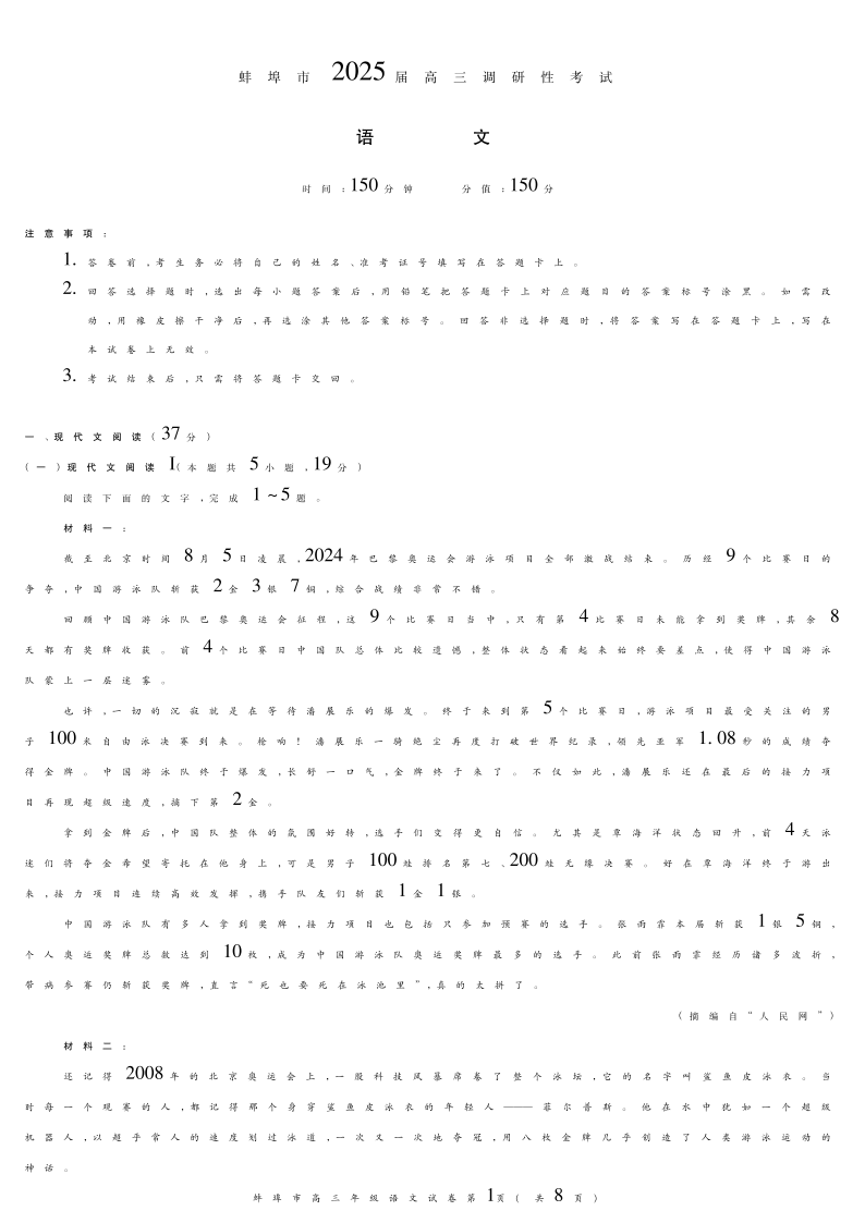安徽省蚌埠市2025届高三年级上学期8月调研性考试 语文