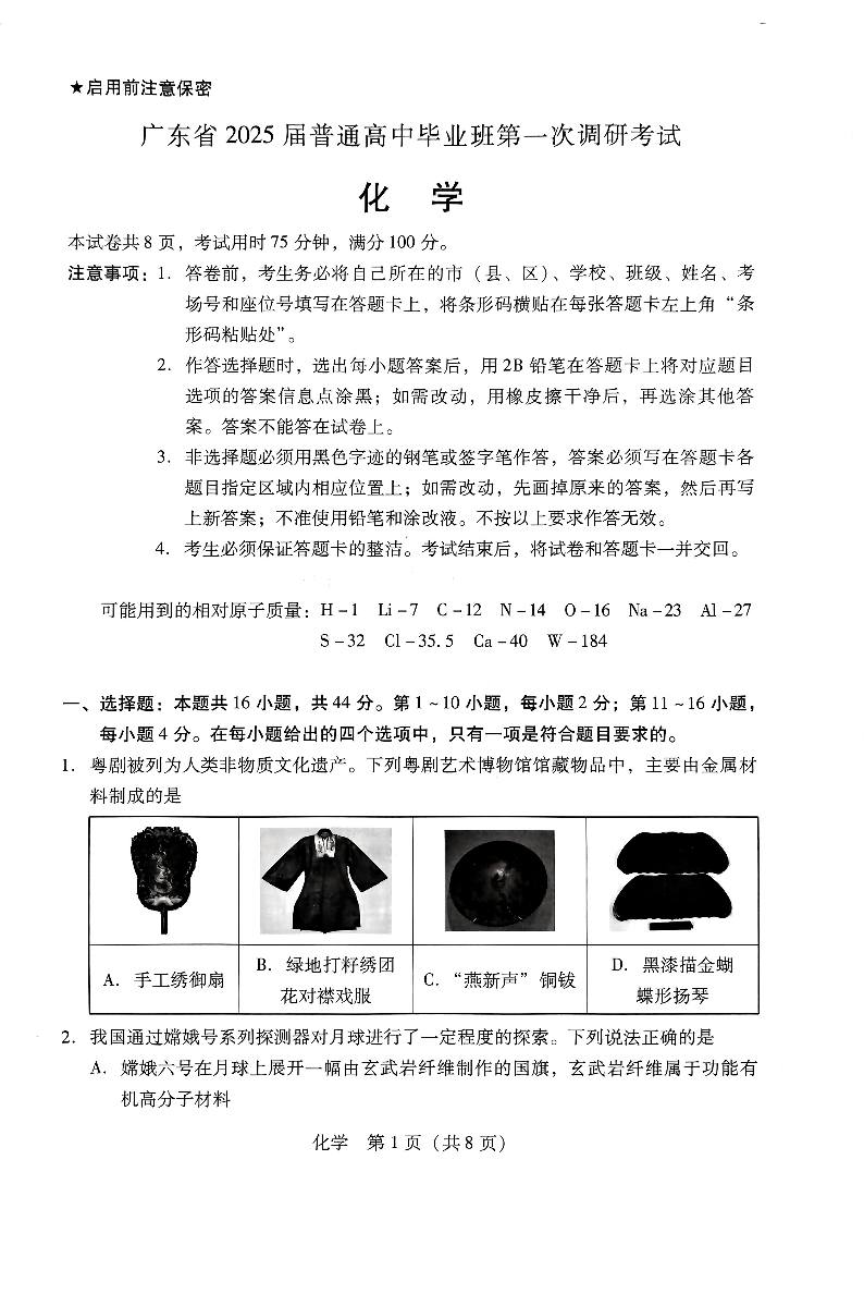 广东省2024-2025学年高三上学期毕业班第一次调研考试 化学