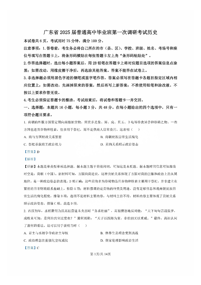 广东省2024-2025学年高三上学期毕业班第一次调研考试 历史答案