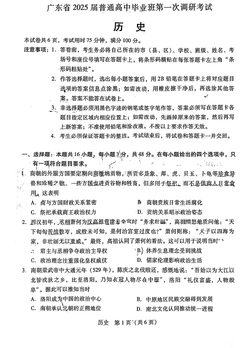 广东省2024-2025学年高三上学期毕业班第一次调研考试 历史