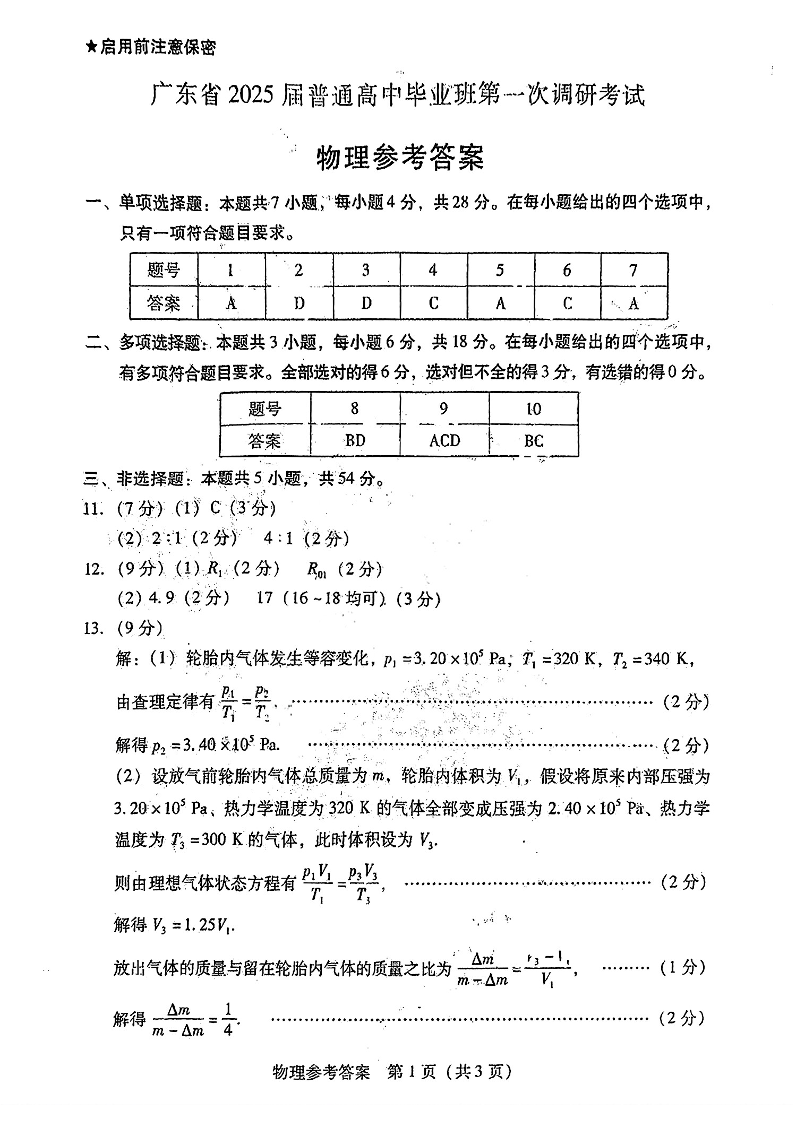 广东省2024-2025学年高三上学期毕业班第一次调研考试 物理答案