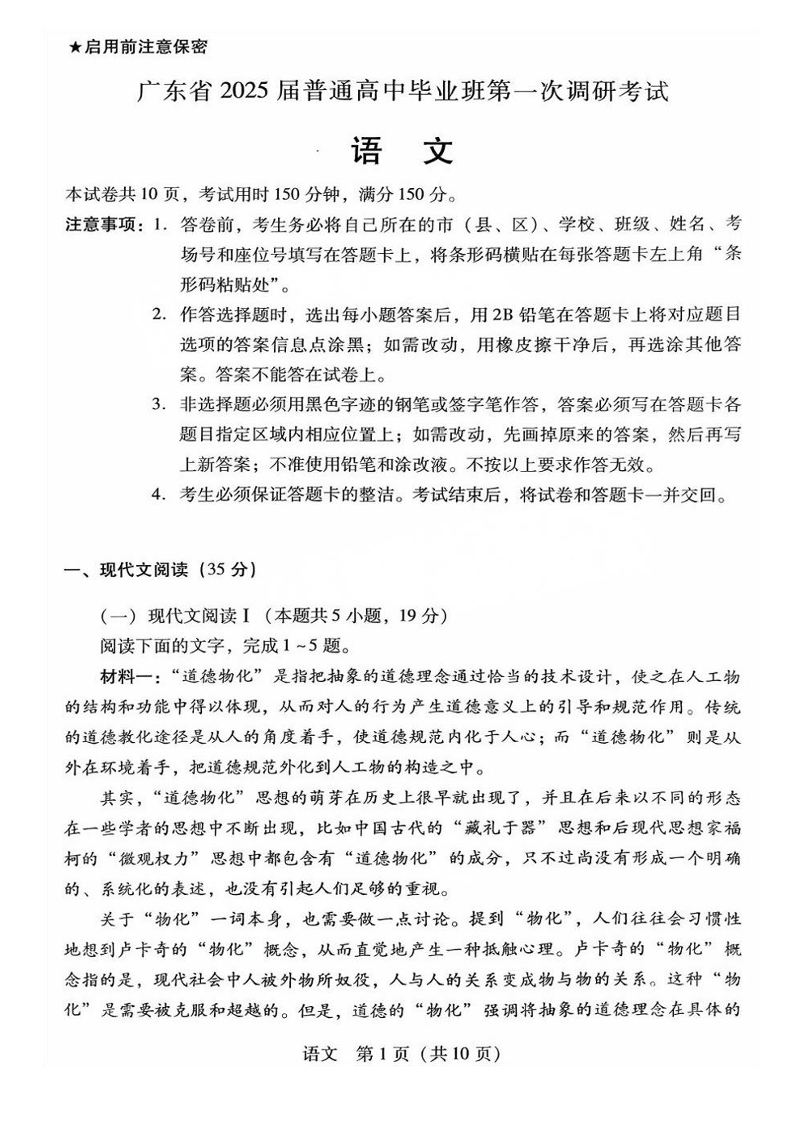 广东省2024-2025学年高三上学期毕业班第一次调研考试 语文