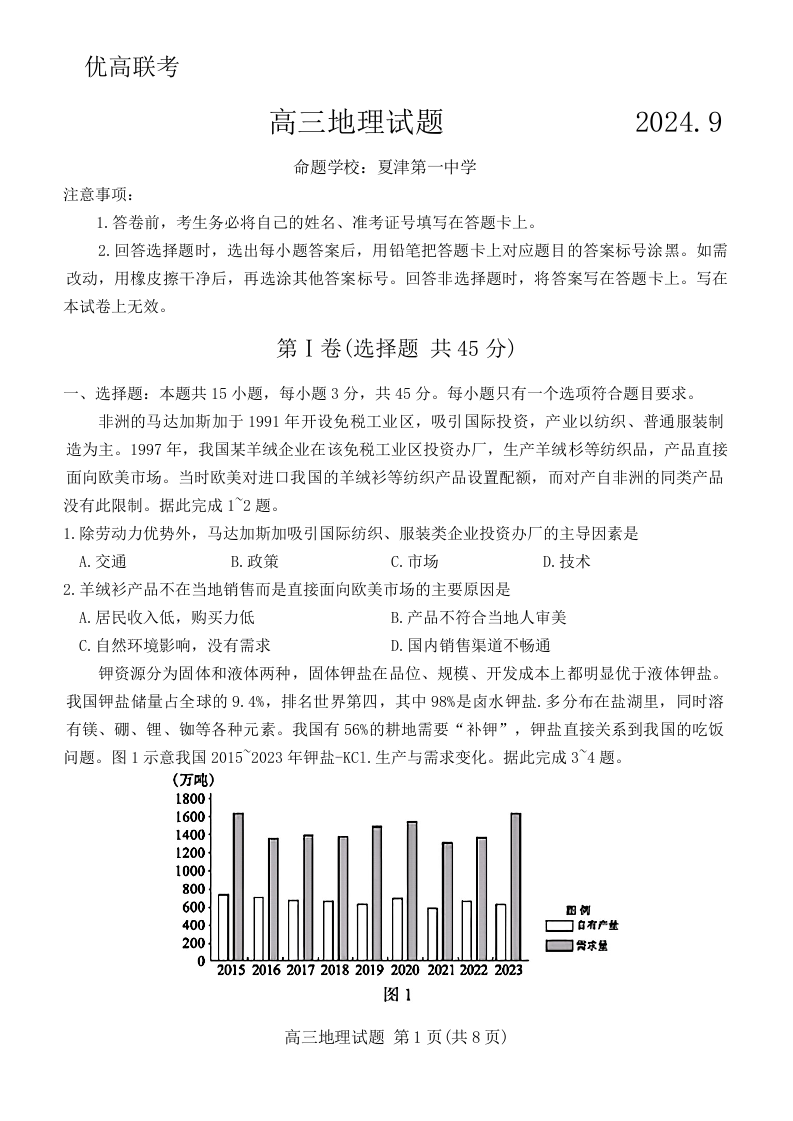 山东省德州市2025届高三上学期开学考 地理