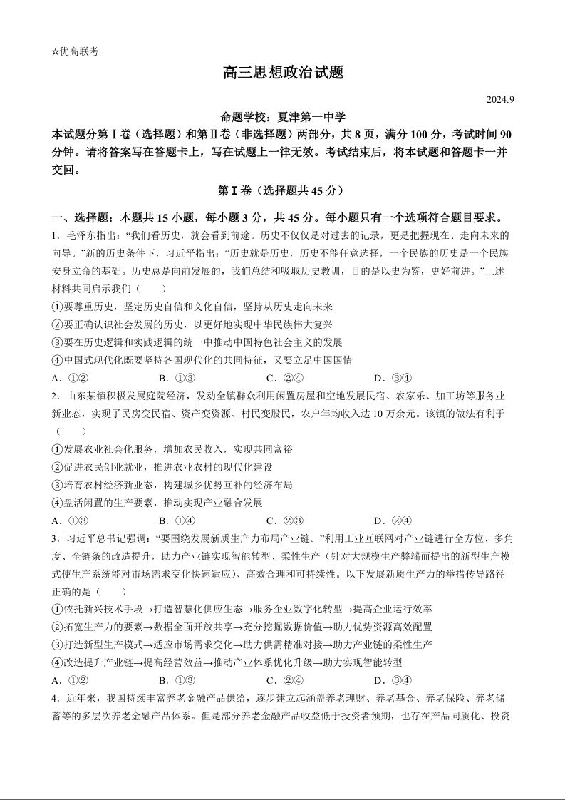 山东省德州市2025届高三上学期开学考 政治