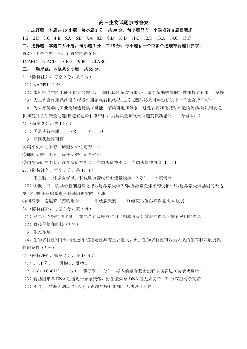 山东省德州市2025届高三上学期开学考 生物答案