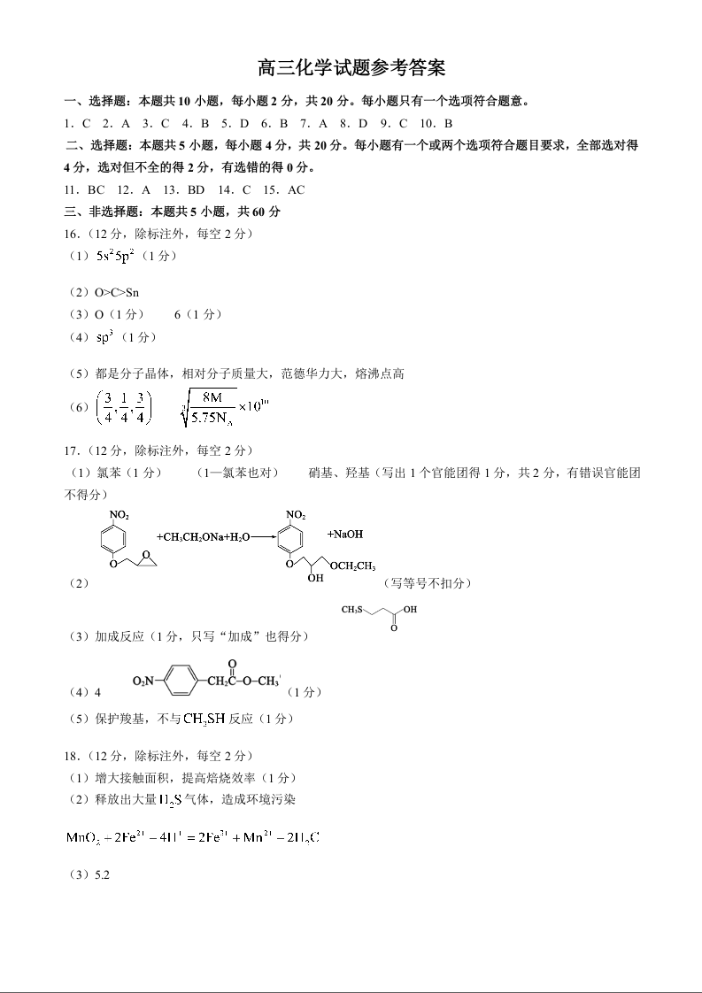 山东省德州市2025届高三上学期开学考 化学答案
