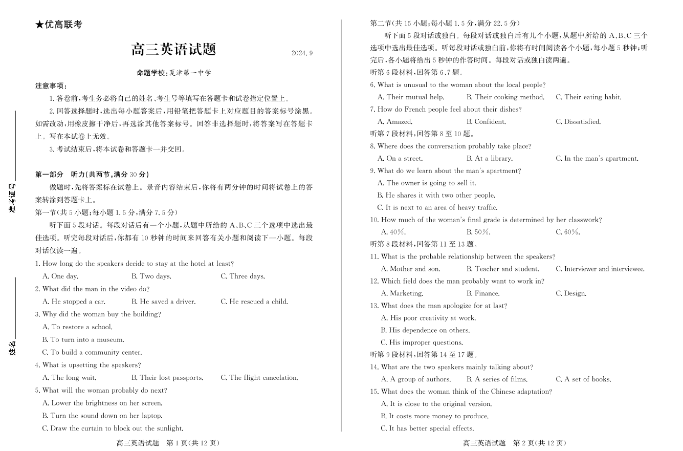山东省德州市2025届高三上学期开学考 英语