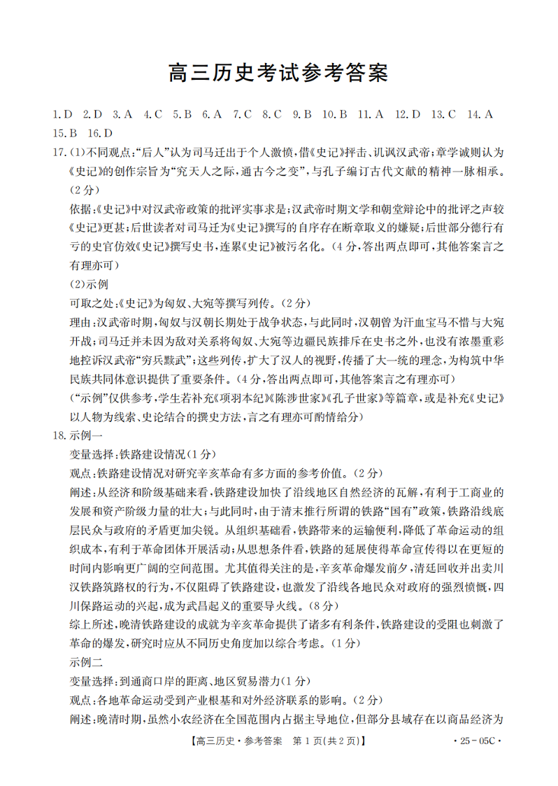 河北省邢台市邢襄联盟2024-2025学年高三上学期开学考试 历史答案