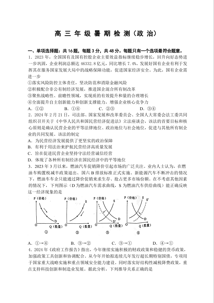 江苏省扬州中学2024-2025学年高三上学期8月开学考试 政治